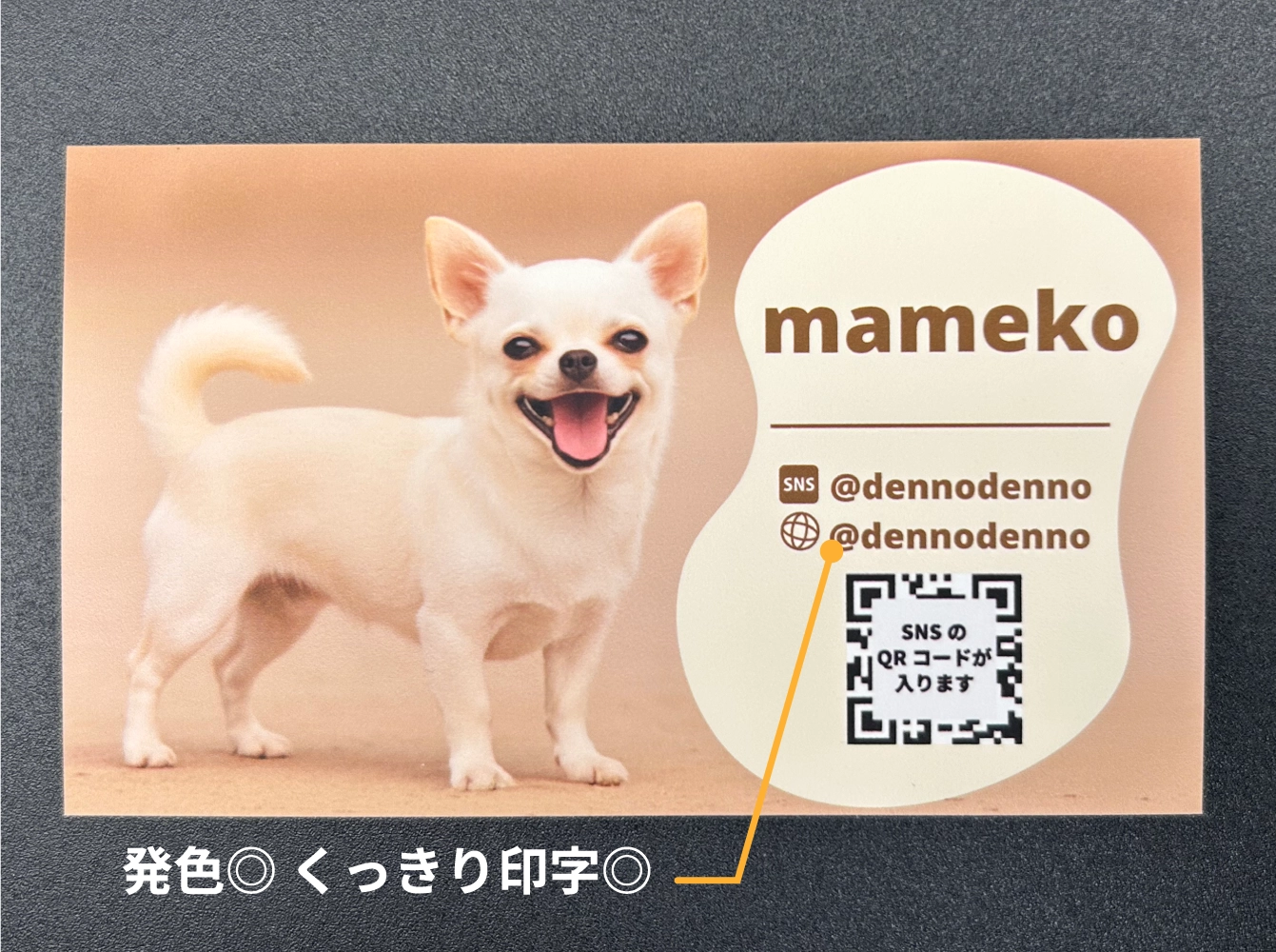 1匹でも多頭飼いでも、名刺のメインとなる、ペットの高画質な写真を用意しましょう。